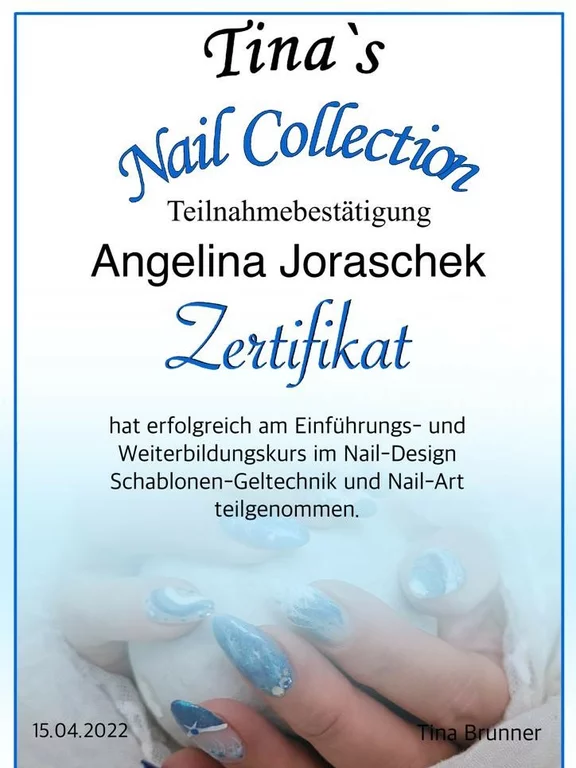 Um dir ein professionelles und sauberes Nageldesign bieten zu können, habe ich 2022 eine Schulung im Bereich Nageldesign erfolgreich abgeschlossen. Dazu gehörten sowohl die Grundlagen als auch weiterführende Techniken wie Schablonen-Geltechnik und Nail Art.